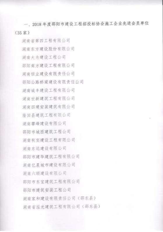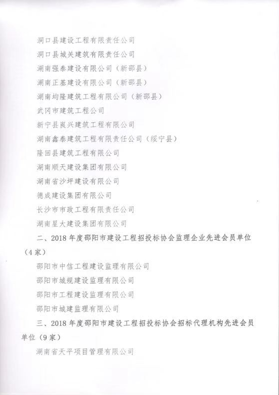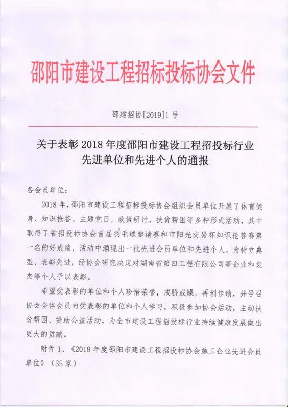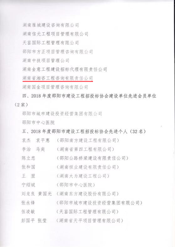 湖南省湘咨工程咨詢有限責(zé)任公司被邵陽(yáng)市建設(shè)工程招標(biāo)投標(biāo)協(xié)會(huì)評(píng)為“2018年度邵陽(yáng)市建設(shè)工程招投標(biāo)行業(yè)”先進(jìn)單位。