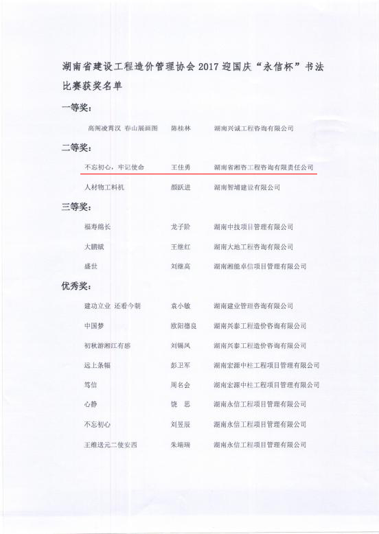 【喜訊】熱烈祝賀我司王佳勇在湖南省建設(shè)工程造價(jià)管理協(xié)會(huì)2017年 “永信杯”書法比賽獲得二等獎(jiǎng)
