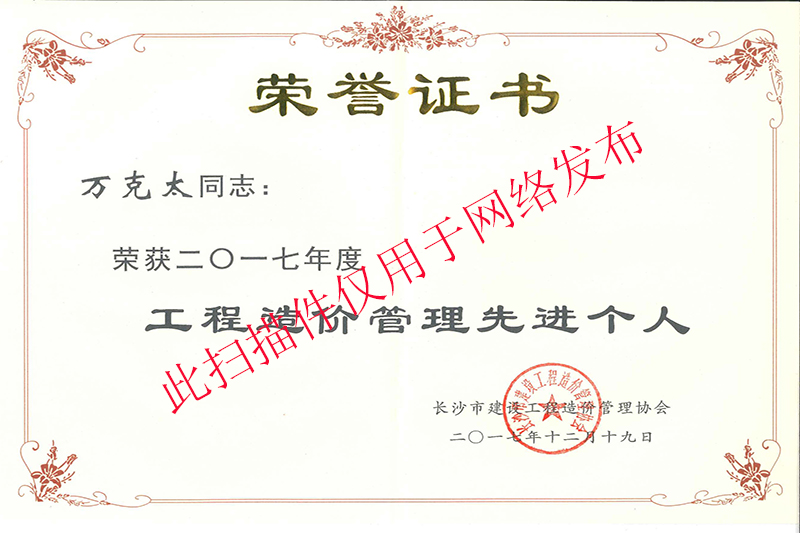 造價(jià)一部經(jīng)理、注冊(cè)造價(jià)工程師萬克太同志榮獲長沙市建設(shè)工程造價(jià)管理協(xié)會(huì)頒發(fā)的2017年度工程造價(jià)管理先進(jìn)個(gè)人稱號(hào)。
