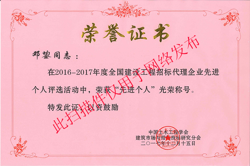 公司鄧鋆總經(jīng)理獲得中國土木工程學(xué)會建筑市場與招標(biāo)投標(biāo)研究分會頒發(fā)的2017年度全國建設(shè)工程招標(biāo)代理企業(yè)先進(jìn)個人稱號