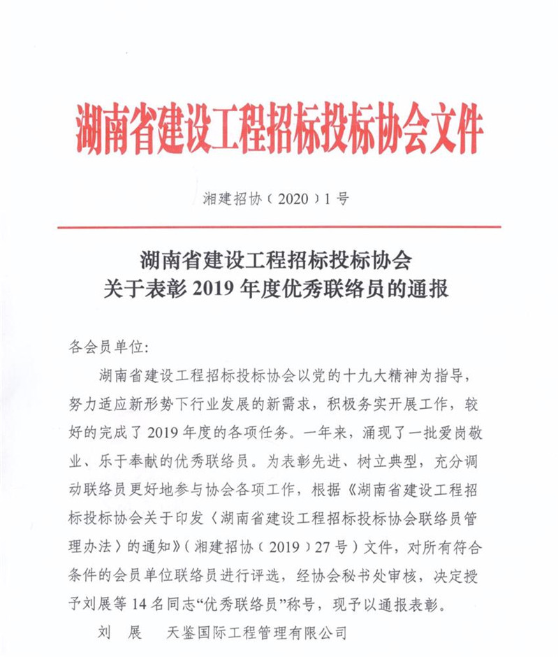 【喜訊】熱烈祝賀我司劉輝獲評湖南省建設(shè)工程招標(biāo)投標(biāo)協(xié)會2019年度優(yōu)秀聯(lián)絡(luò)員
