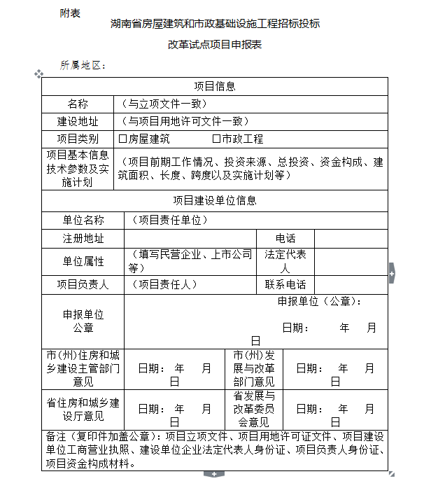 1.申報材料。項目申報單位可根據(jù)《試點方案》要求,填寫《湖南省房屋建筑和市政基礎(chǔ)設(shè)施工程招標(biāo)投標(biāo)改革試點項目申報表》(可在湖南省建設(shè)工程招標(biāo)投標(biāo)網(wǎng)http://www.hnztb.org/自行下載),并將其他相關(guān)材料編制成冊(一式三份蹋并附全套資料的電子文檔。