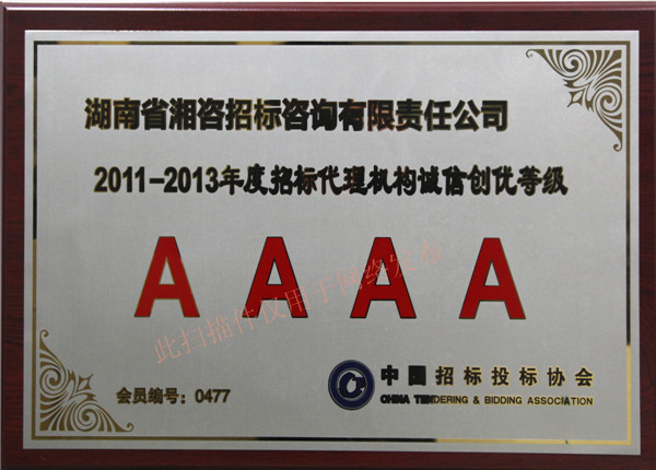 熱烈慶祝我司榮獲2011-2013年度招標(biāo)代理機(jī)構(gòu)誠信創(chuàng)優(yōu)等級(jí)4A單位
